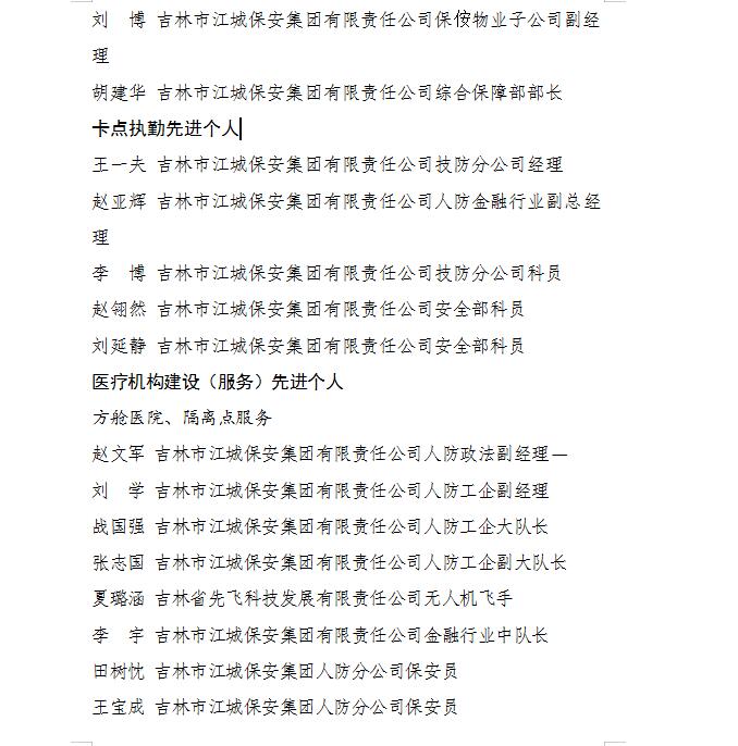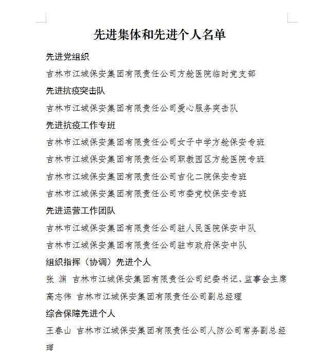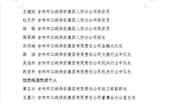 • 喜報 吉林市江城保安集團有限責任公司10個集體、31名個人獲市國資委黨委通報表揚
